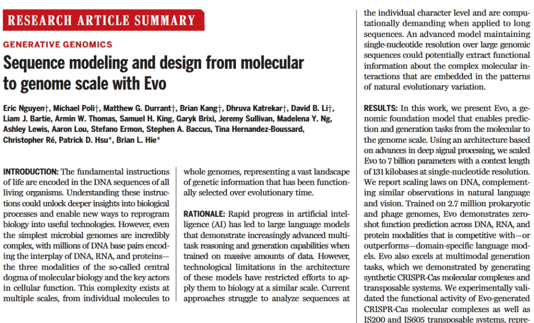 斯坦福大学Arc研究所团队开发了名为Evo的基因组基础模型,并在《Science》期刊上发表封面文章,该模型首次实现了从单核苷酸分辨率到兆碱基尺度(>1 Mbp)的DNA序列建模与多模态生成。该研究通过架构创新、超大规模数据训练及系统性实验验证,为合成生物学与基因组工程提供了全新的范式。